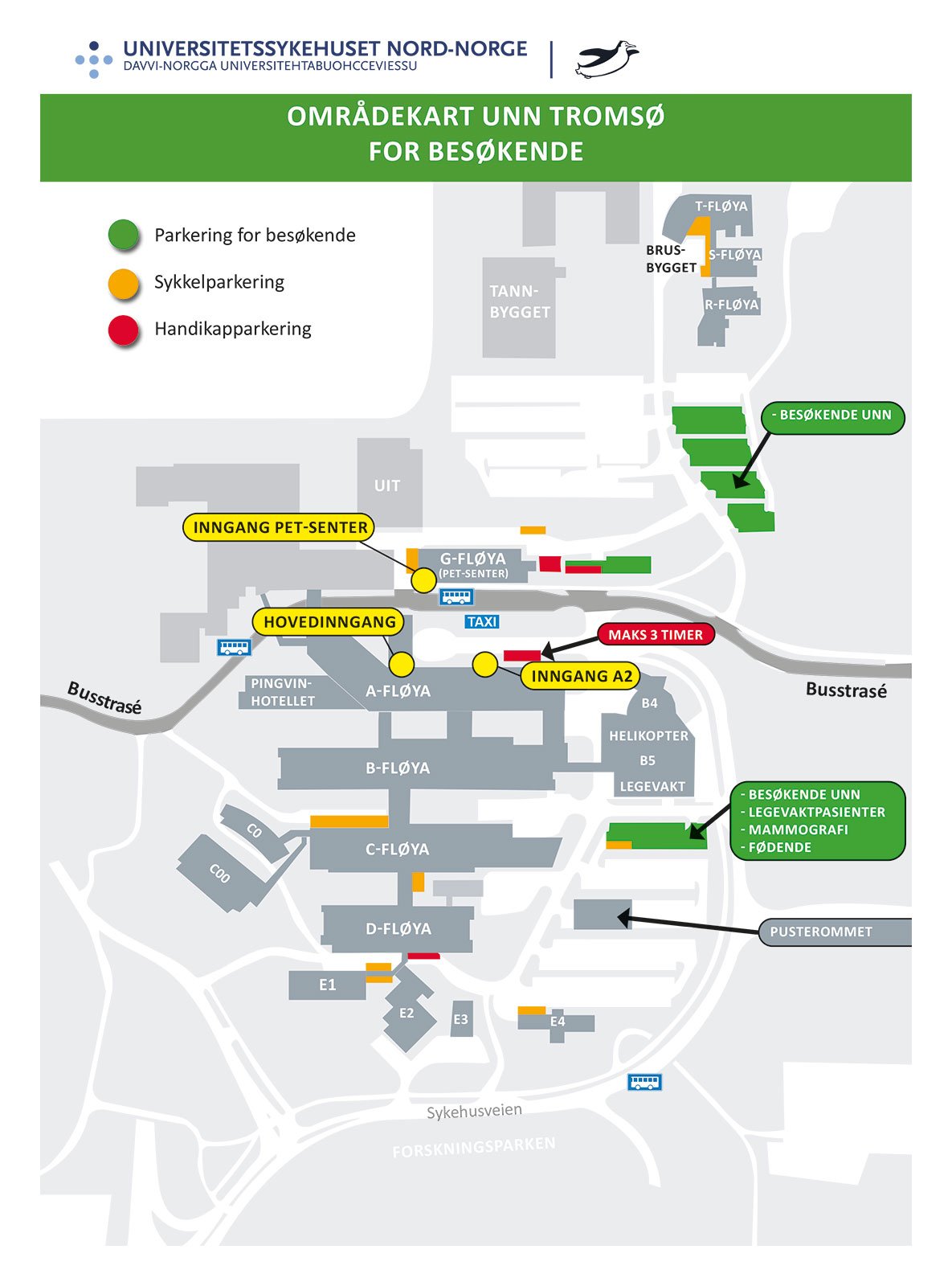 Søndag: 10:00 - 20:00Kulturseksjonen i UNN arrangerer jevnlig lunsjkonserter på Pingvinen Scene ved hovedinngangen. Konsertene starter som regel klokka 1130. Informasjon om hvem som spiller henger i heisene.Musikk er også helse, og med jevne mellomrom arrangeres det ”musikkvandring” i sykehuset. Ta kontakt med sykepleier på avdelinga dersom du er innlagt hos oss og ønsker besøk av musikerne våre.Hvert år før jul arrangerer kulturseksjonen julemesse på plan 6 og 7 ved hovedinngangen.Vi har flere gjesteparkeringer. Det er en ved PET-senteret, en overfor PET-senteret, og en rett nedenfor legevakta. Gjesteparkeringene er markert med grønt på kartet.