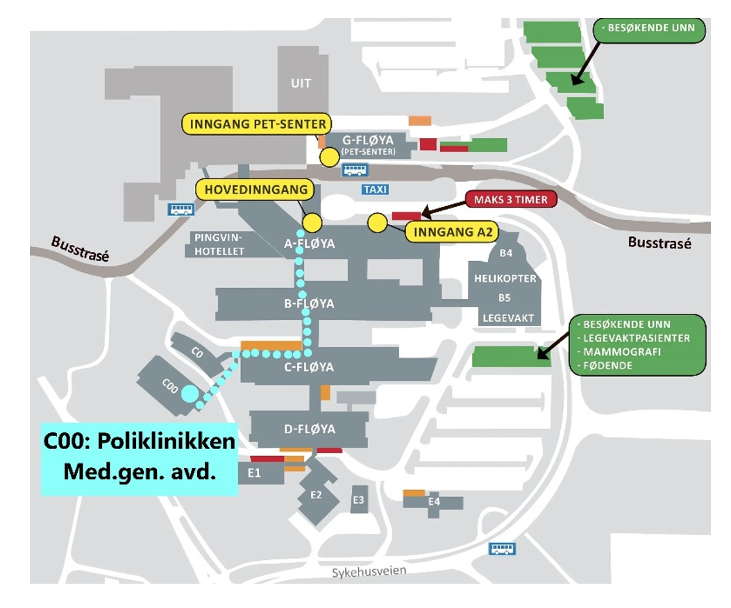 Vi er lokalisert på plan 3 i C00-fløyen. Vennligst gå til plan 4 i C-fløyen, og følg deretter skiltene til C00 og Medisinsk genetisk poliklinikk.